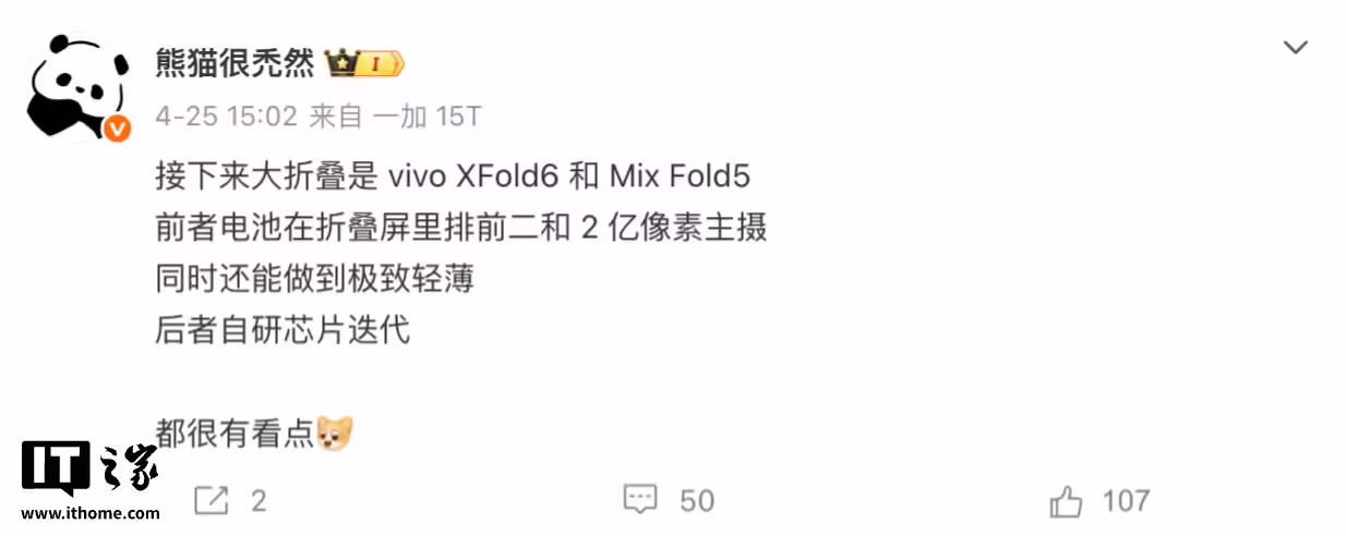博主 @熊猫很禿然 发文,透露 vivo XFold6 和小米 Mix Fold 5 两款折叠手机即将登场,其中 vivo XFold6 在保证极致轻薄的同时,实现“电池在折叠屏里排前二”,同时配备 2 亿像素主摄。而小米 Mix Fold5 将迭代自研芯片,预计为全新玄戒芯片。