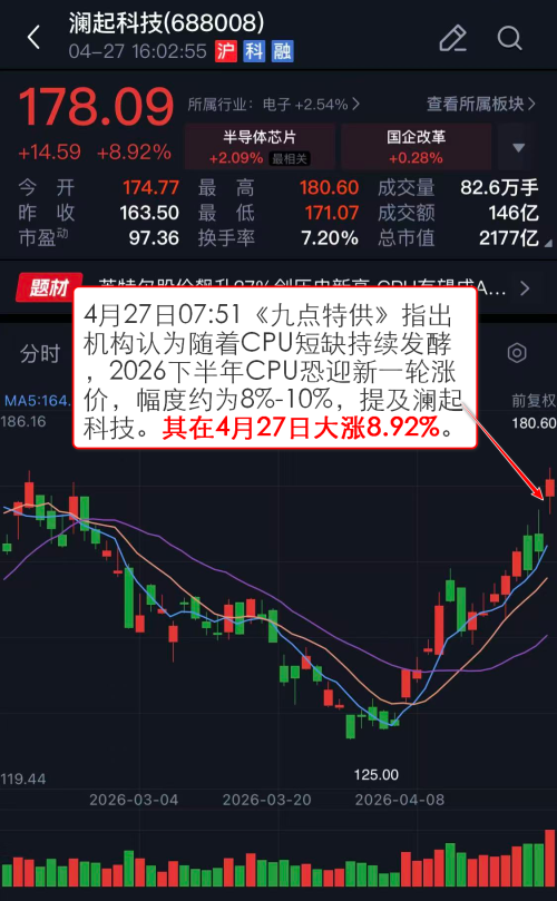 4月27日07:51《九点特供》 指出机构认为随着CPU短缺持续发酵 ,2026下半年CPU恐迎新一轮涨价,幅度约为8%-10%,提及澜起科技。其在4月27日大涨8.92%。