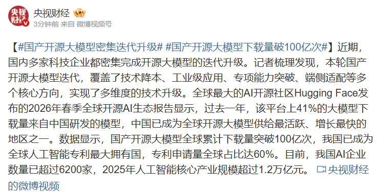 近期,国内多家科技企业都密集完成开源大模型的迭代升级。记者梳理发现,本轮国产开源大模型迭代,覆盖了技术降本、工业级应用、专项能力突破、端侧适配等多个核心方向,实现了多维度的技术升级。全球最大的AI开源社区Hugging Face发布的2026年春季全球开源AI生态报告显示,过去一年,该平台上41%的大模型下载量来自中国研发的模型,中国已成为全球开源大模型供给最活跃、增长最快的地区之一。数据显示,国产开源大模型全球累计下载量突破100亿次,我国已成为全球人工智能专利最大拥有国,专利申请量全球占比达60%。目前,我国AI企业数量已超过6200家,2025年人工智能核心产业规模超过1.2万亿元。