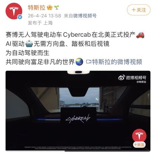 4月25日,特斯拉中国发布消息,确认无方向盘、无脚踏板的特斯拉赛博无人驾驶电动车Cybercab正式投产。据悉,该车型最早于2024年10月10日在特斯拉“WE, ROBOT”发布会上正式亮相。今年2月,特斯拉Cybercab比原计划提前两个月量产下线。