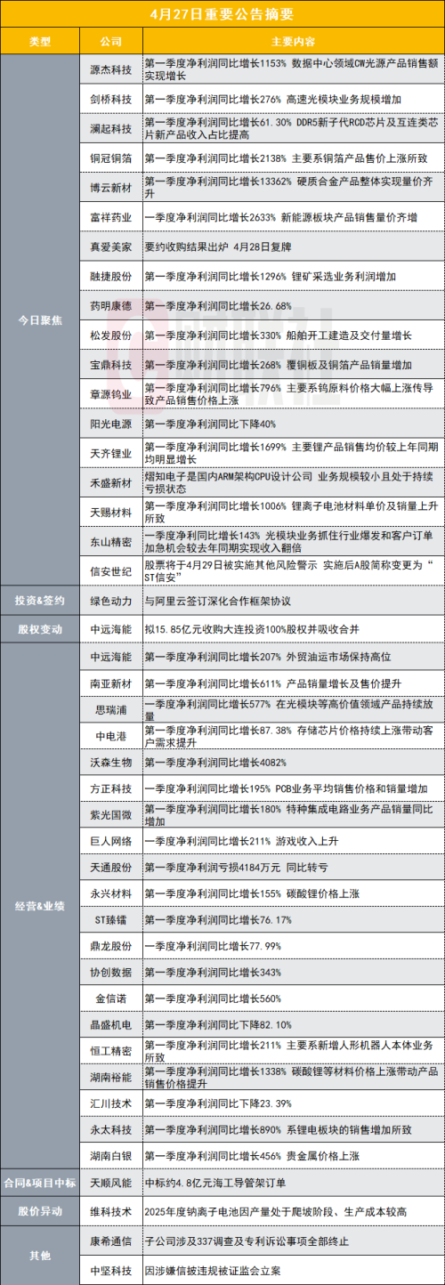 天赐材料(002709.SZ)公告称,2026年第一季度实现营业收入66.73亿元,同比增长91.29%;归属于上市公司股东的净利润为16.54亿元,同比增长1005.75%。业绩变动主要系报告期内锂离子电池材料单价及销量上升所致。小财注:公司Q1净利润16.54亿,2025年Q4净利润9.41亿,据此计算,Q1净利润环比增长75%。