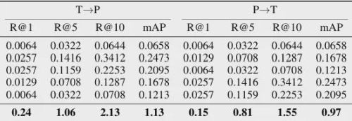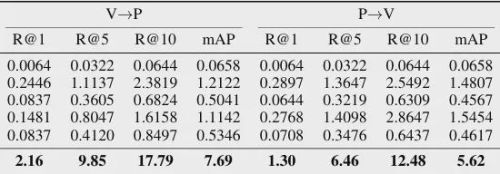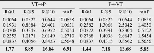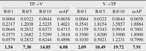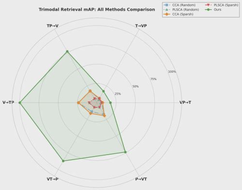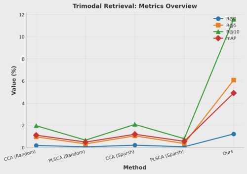 三模态联合条件下的检索结果,用于评估多模态信息协同建模的能力: