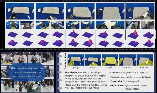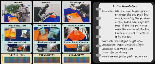 - 感知数据:支持常见的感知器件,统一格式至大尺度的视觉反馈(多视角协同融合的RGB-D图像)和小尺度的触觉反馈(操作级的接触图像)