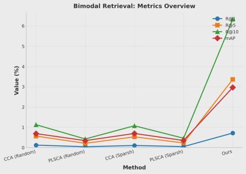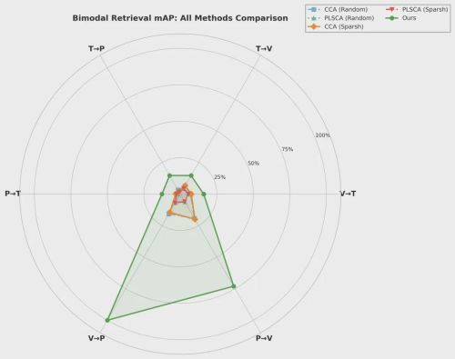 通过上述方法,实现了不同模态之间的有效对齐与协同学习。为进一步验证所提出多模态对齐方法的有效性,我们在双模态与三模态设置下开展了系统性的跨模态检索实验,对模型的跨模态检索能力进行全面评估。双模态检索任务的性能表现,反映了任意两种模态之间的对齐效果: