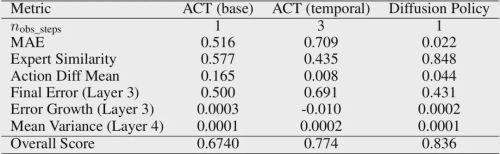 我们选择ACT(base)、ACT(temporal)、Diffusion Policy策略在VTouch数据集上进行验证,得到结论: