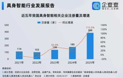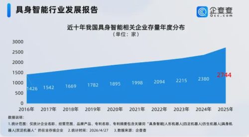 企查查一组数据,勾勒出这个行业的当下:近十年,我国具身智能相关企业存量逐年稳定增加,截至2025年年底,我国在业存续2744家具身智能相关企业。截至2026年4月27日,我国现存2861家具身智能相关企业。其中2025年全年,我国具身智能相关企业注册量同比大幅增加115.6%至388家,达近五年注册量及其增速双高峰。