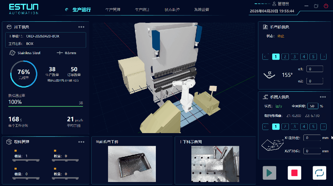 在 Bending Cell 中,总控系统并不是简单的监控界面,而是一个集控制、调度与管理于一体的核心平台。通过AI数字孪生技术,系统可以实现1:1实时同步还原工作站运行状态,包括机器人动作、设备状态以及生产进度,使原本不可见的生产过程变得直观透明。