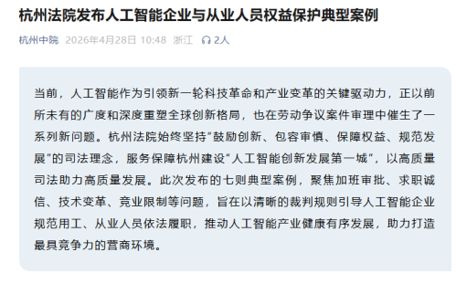 4月28日,“杭州中院”官方公众号公布了一起《技术变革背景下企业调岗应兼顾劳动者合法权益——某网讯科技公司与周某劳动争议案》。